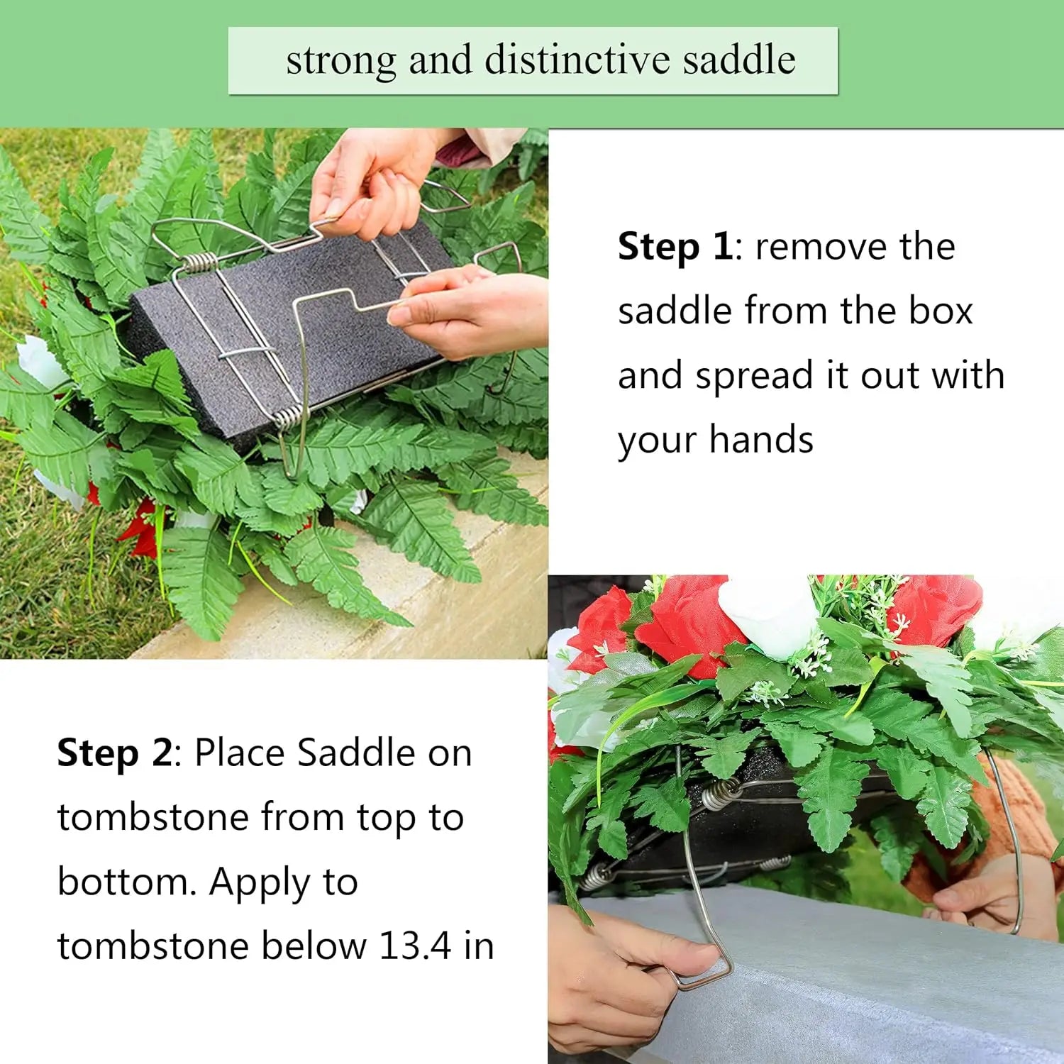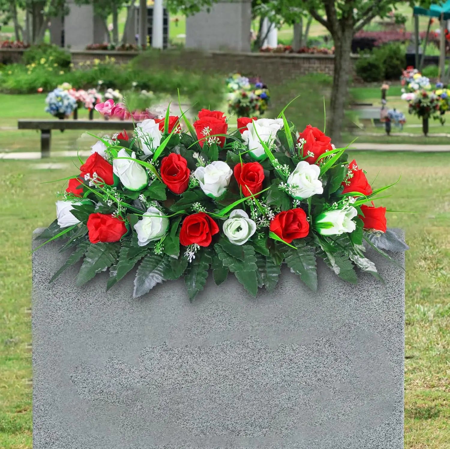 Honor cherished memories with this elegant Headstone Saddle Bouquet, designed to bring timeless beauty and grace to gravesites. This stunning arrangement of red and white roses sits perfectly atop headstones, creating a dignified tribute that celebrates the life of your loved one. Crafted with lifelike detail and weather-resistant materials, this memorial bouquet maintains its beauty through every season.